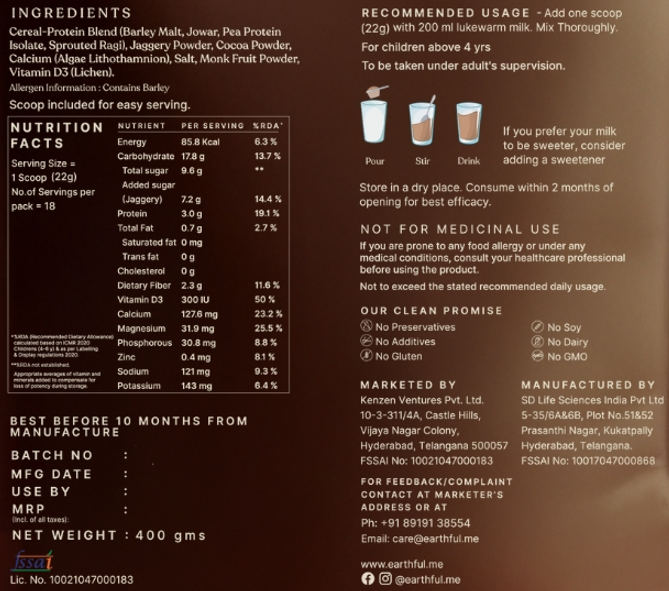 Earthful Kids Millet Mix is made of wholegrains including ragi, jowar and barley malt. The blend features Calcium, Vitamin D3 and Protein from Peas. Additionally, it is a good source of minerals including potassium, magnesium, and phosphorus. The mix is naturally sweetened with jaggery and monk fruit – so mothers, no need to worry about cavities. Earthful is free from synthetic ingredients and additives, making it a clean, wholesome choice.