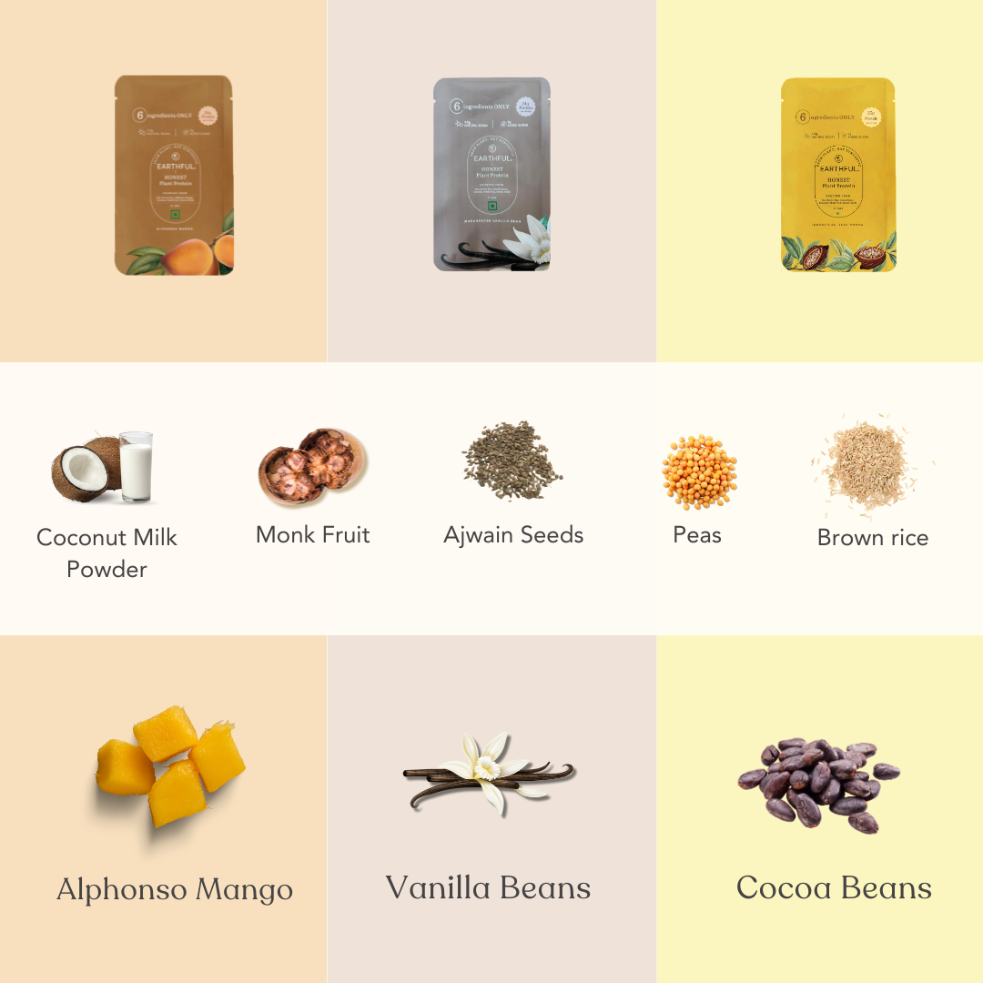 Earthful's Clean Plant Protein is the only Protein with all the 9 essential Amino acids & 11 Non Essential Amino Acids that are needed by our Body. The Protein is sourced from Pea & Brown Rice. This powerful blend also contains Ajwain Powder which make digestion easier & you need not worry about bloating. Besides, we use the highest quality, real ingredients for a clean, natural taste. There are also brands which call themselves “Plant-Based'' but when you look at the back of the pack you will find that synthetic ingredients are being used. On the other hand, we clearly list the sources for you to understand. The ingredients are always kept transparent for you so that you don’t need to worry about the side-effects of synthetic ingredients by consuming Earthful.