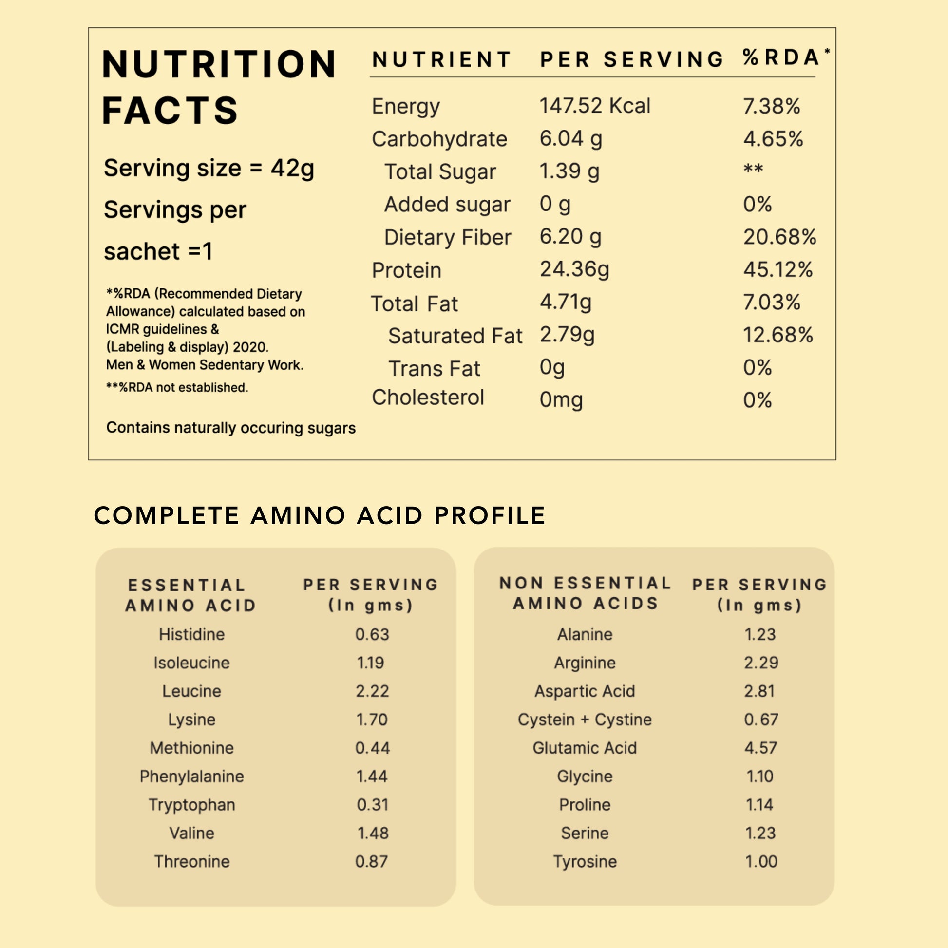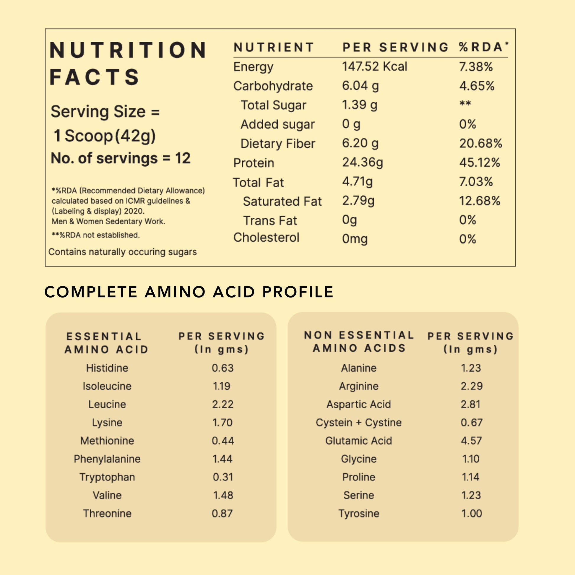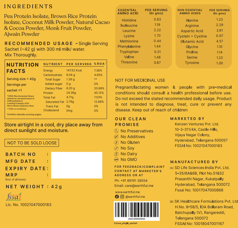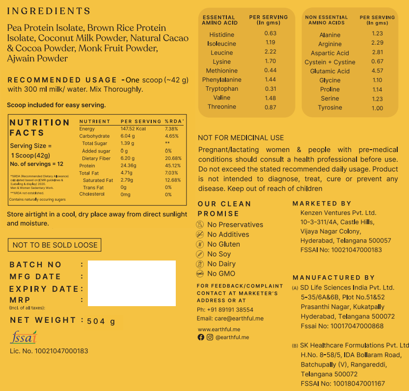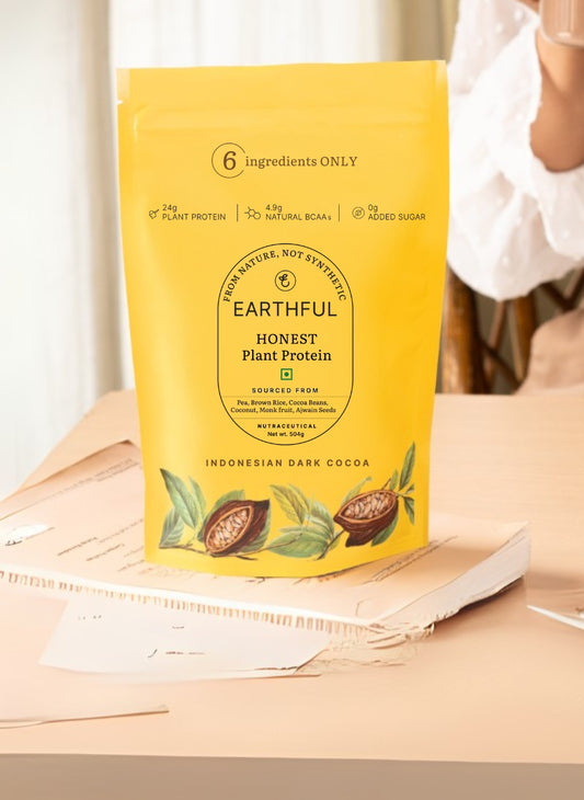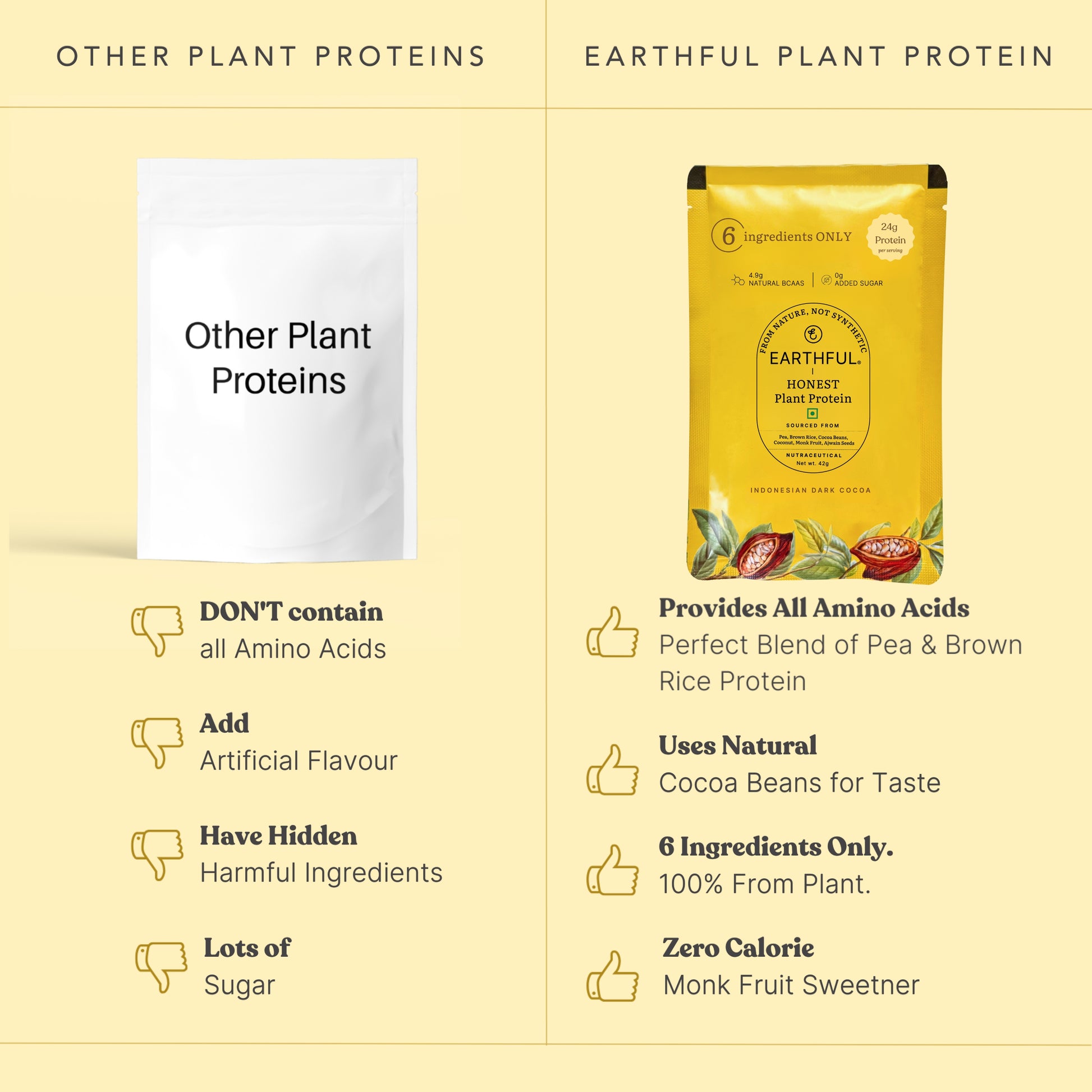 Earthful's Clean Plant Protein is the only Protein with all the 9 essential Amino acids & 11 Non Essential Amino Acids that are needed by our Body. The Protein is sourced from Pea & Brown Rice. This powerful blend also contains Ajwain Powder which make digestion easier & you need not worry about bloating. Besides, we use the highest quality of Cocoa Beans to give the natural Chocolate taste. There are also brands which call themselves “Plant-Based'' but when you look at the back of the pack you will find that synthetic ingredients are being used. On the other hand, we clearly list the sources for you to understand. The ingredients are always kept transparent for you so that you don’t need to worry about the side-effects of synthetic ingredients by consuming Earthful.