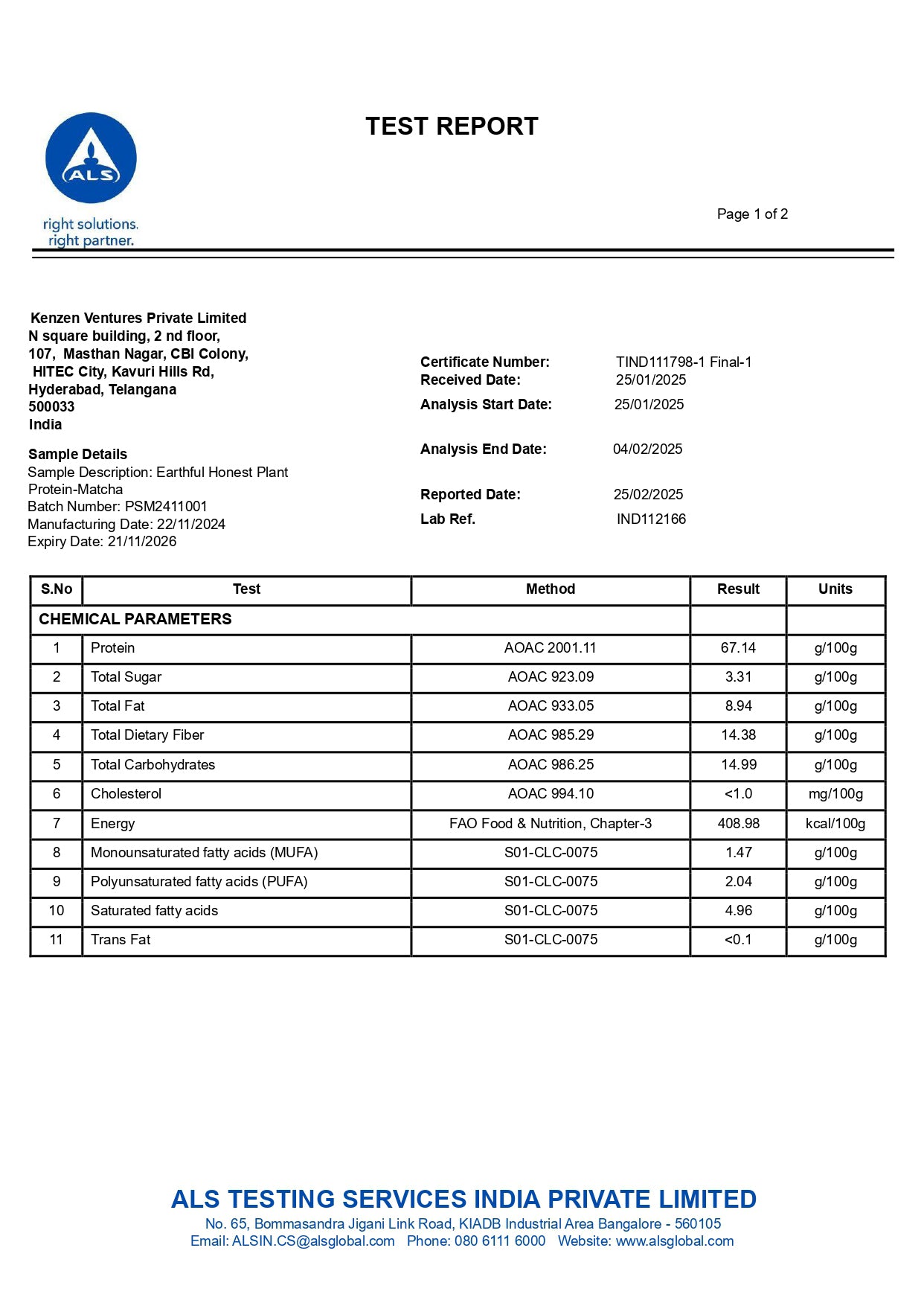 Earthful's Clean Plant Protein is the only Protein with all the 9 essential Amino acids & 11 Non Essential Amino Acids that are needed by our Body. The Protein is sourced from Pea & Brown Rice. This powerful blend also contains Ajwain Powder which make digestion easier & you need not worry about bloating. Besides, we use the highest quality of Japanese Matcha Green Tea to give the natural Matcha taste. There are also brands that call themselves “Plant-Based'' but when you look at the back of the pack you will find that synthetic ingredients are being used. On the other hand, we clearly list the sources for you to understand. The ingredients are always kept transparent for you so that you don’t need to worry about the side-effects of synthetic ingredients by consuming Earthful.