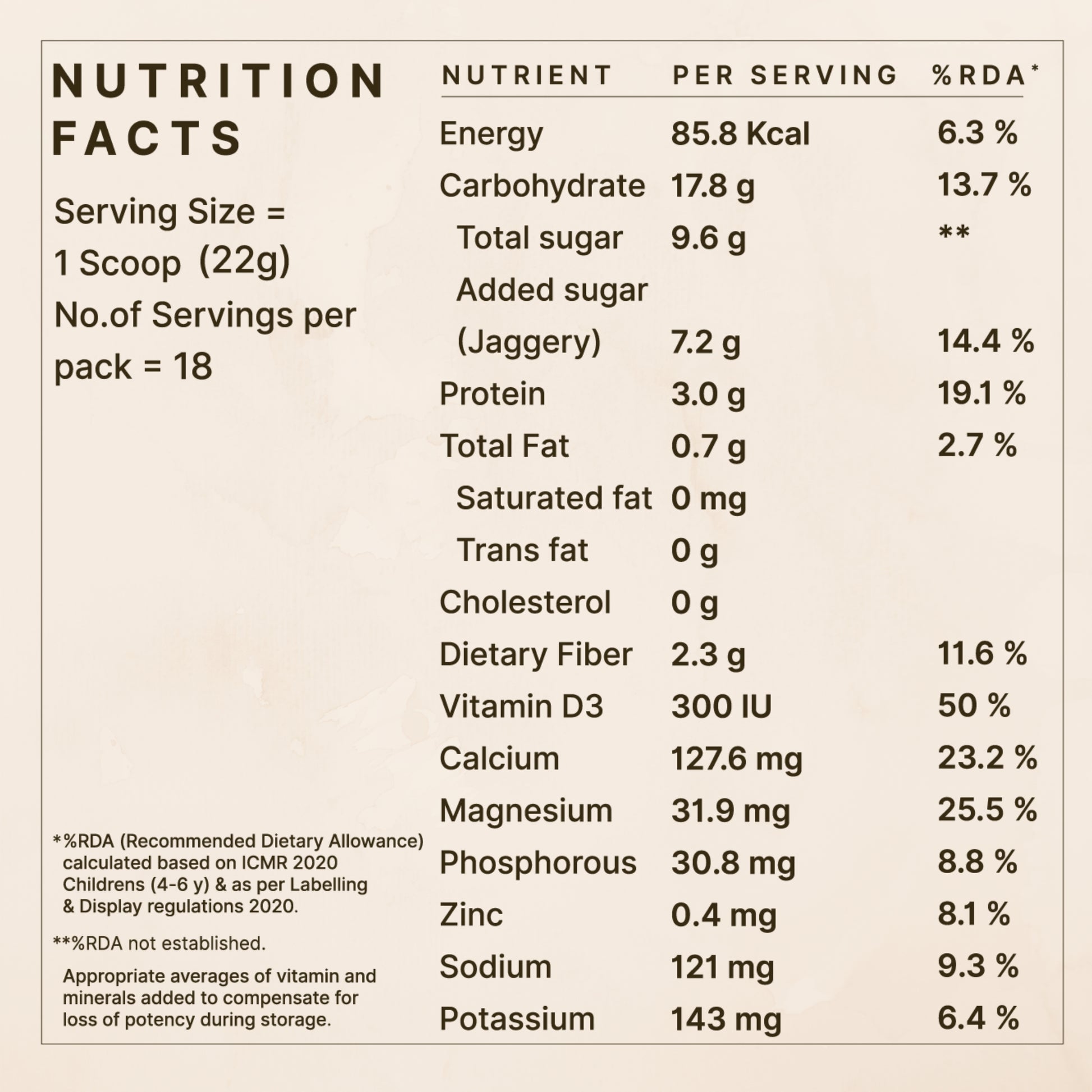 Mix 1 scoop (20 gms) with 200 ml of lukewarm milk for a tasty treat! Perfect for millet porridge, smoothies, or as a cereal drink. Whip up a quick millet smoothie with Ragi, Fruits, and Dates – A simple, nutritious, gluten-free breakfast!