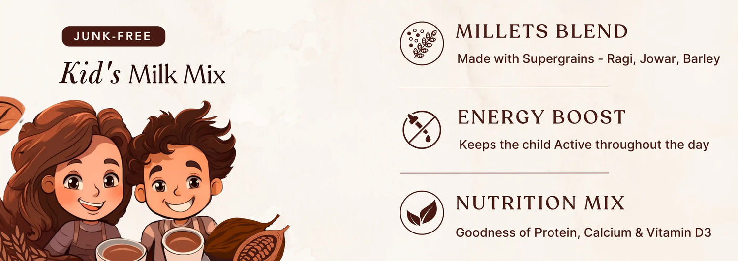 Nutri drinks, like Earthful Kids Millet Mix, are an excellent way to provide children with the additional nourishment they need to stay healthy and active. Unlike other health drinks, our Millet Mix is plant-based, free from artificial flavors and preservatives, making it a safe and effective option for children. Additionally, it is rich in fiber and contains no refined sugar.