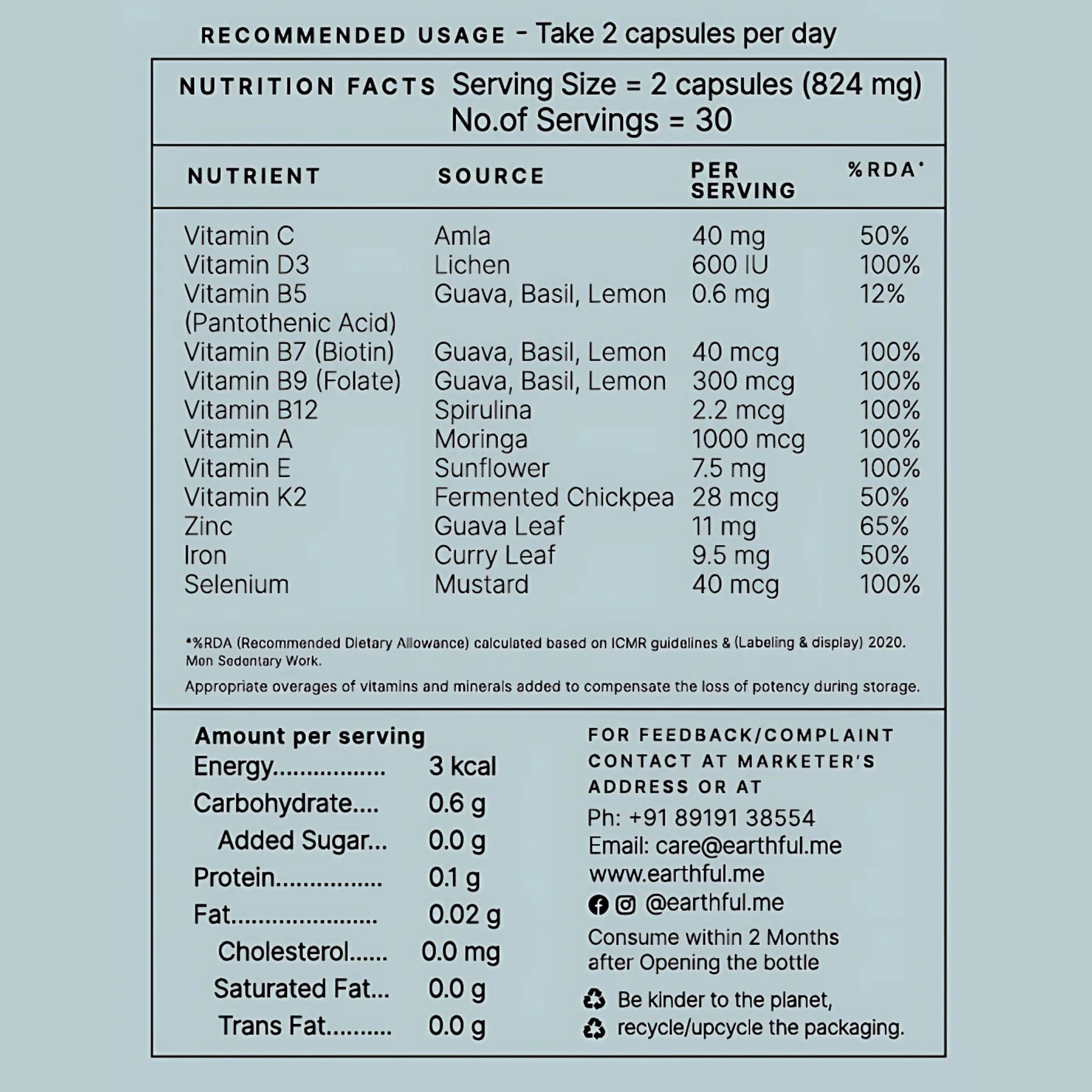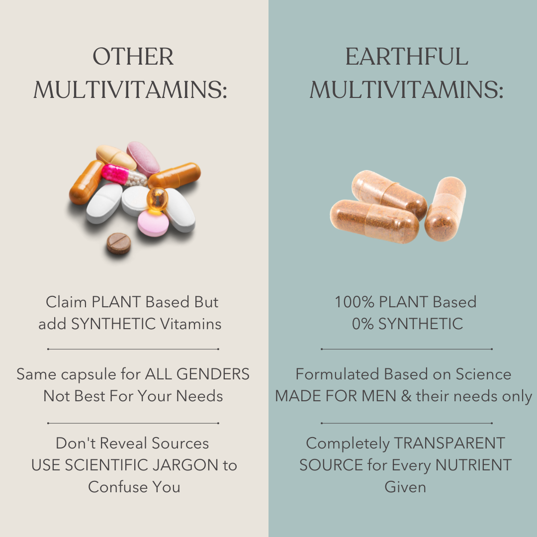 Earthful is the only reliable brand in the market which makes multivitamin from plants only. There are brands which call themselves “Plant-Based'' but when you look at the back of the pack you will find that synthetic vitamins are being used. On the other hand, we clearly list the sources of the vitamins for you to understand. The ingredients are always kept apparent for you so that you don’t need to worry about the side-effects of synthetic ingredients by consuming Earthful.