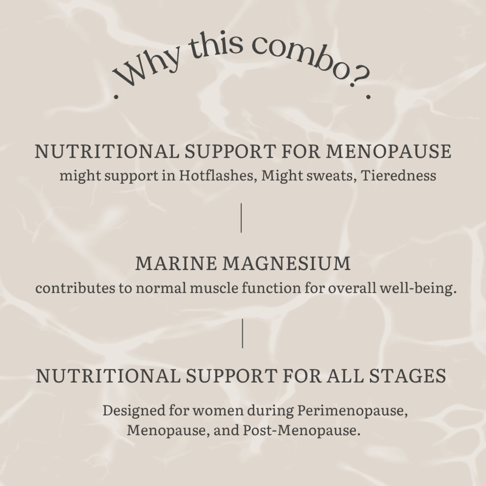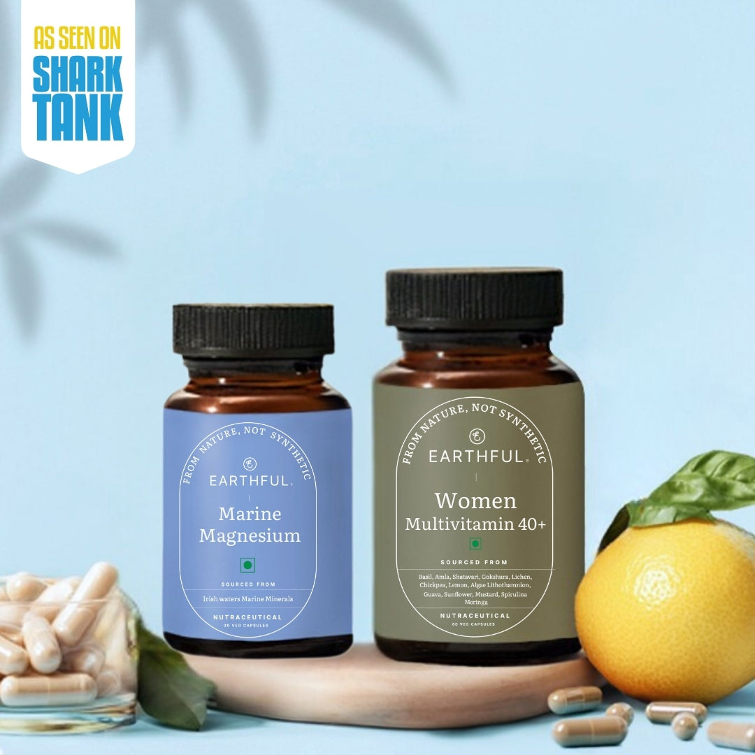 Menopause brings physical, psychological, and physiological changes. Multivitamin Women 40+ is formulated with natural herbs like Shatavari & Gokshura and essential nutrients to support overall health, while Magnesium is a mineral that helps promote restful sleep, calm nerves, and reduce stress. Consuming both the Women Multivitamin 40+ and Marine Magnesium will help support you during menopause.