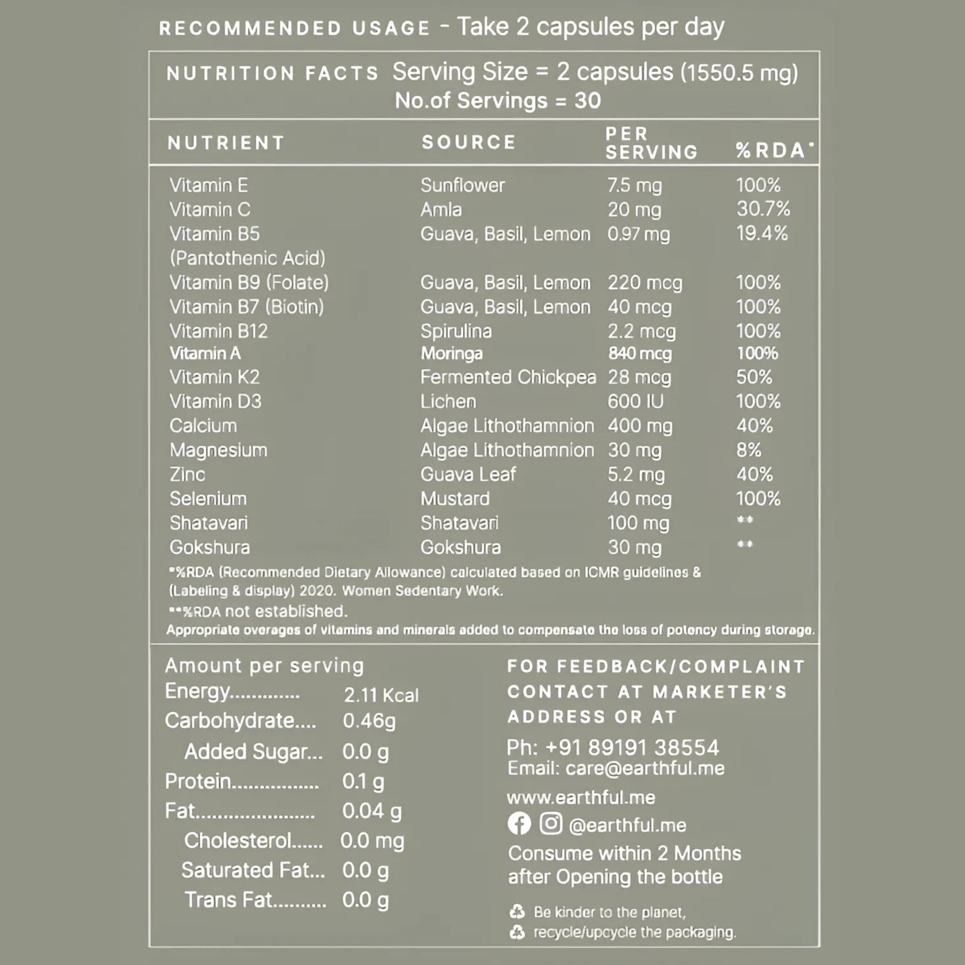 Along with the active herbs like Shatavari, Gokshura, we have also added several vitamins and minerals sourced naturally to ensure your overall well- being. Earthful is the only reliable brand in the market which makes multivitamin from plants only. There are brands which call themselves “Plant-Based'' but when you look at the back of the pack you will find that synthetic vitamins are being used. On the other hand, we clearly list the sources of the vitamins for you to understand. The ingredients are always kept transparent for you so that you don’t need to worry about the side-effects of synthetic ingredients by consuming Earthful.